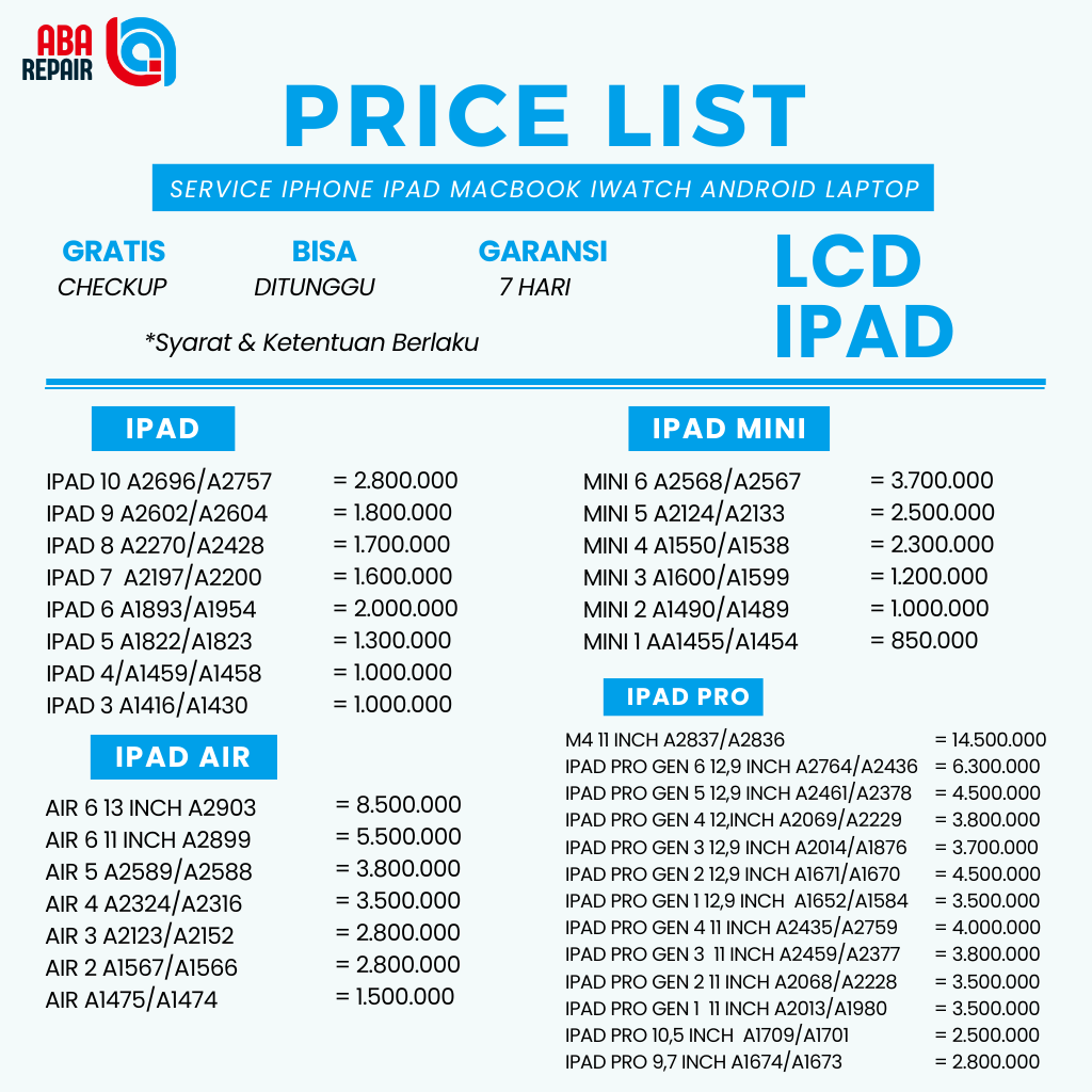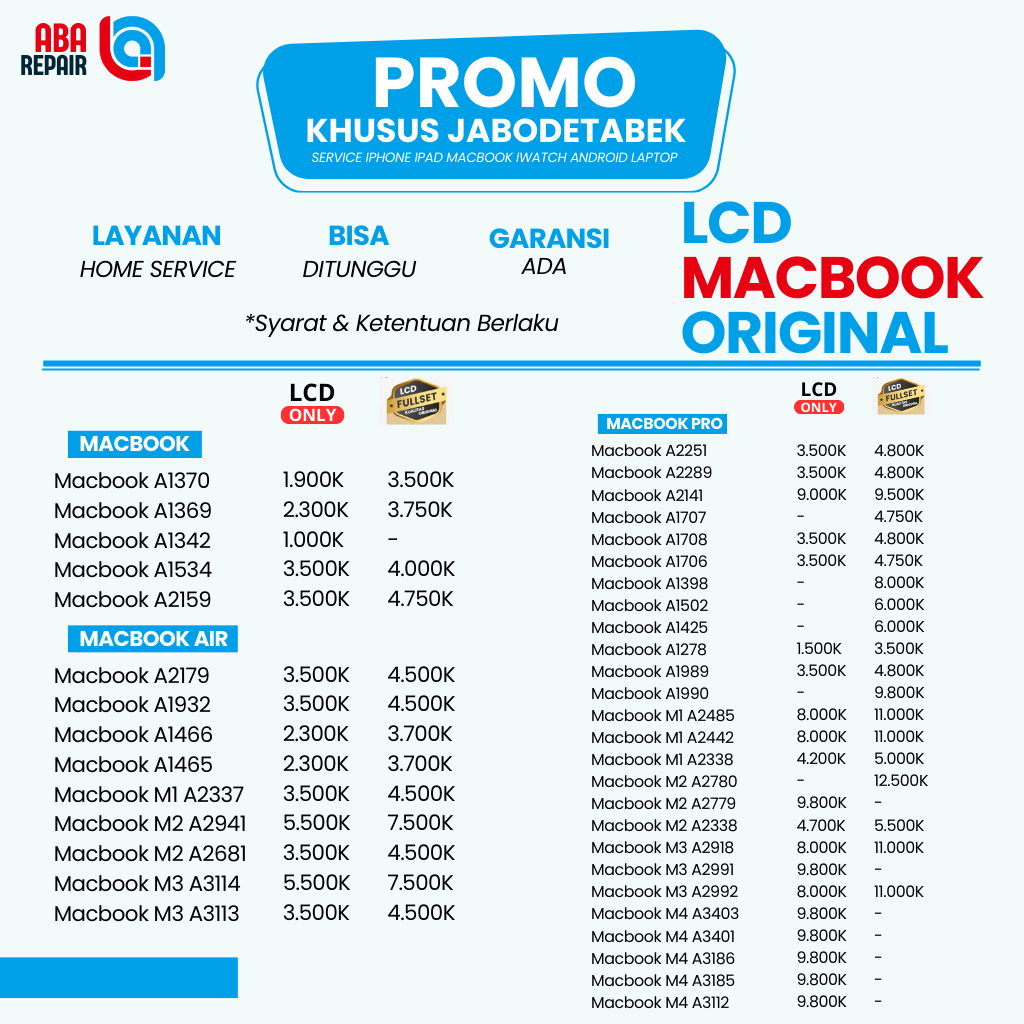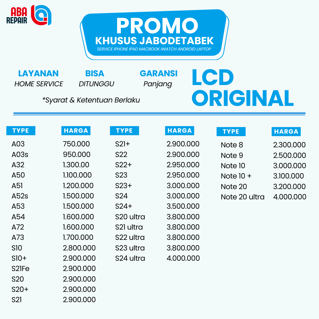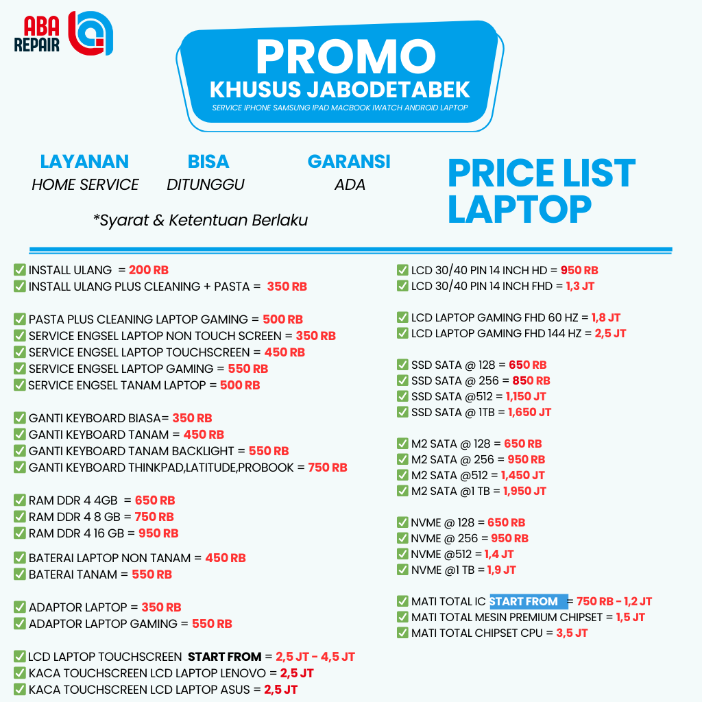 Dapatkan spesial promo dan harga spesial service di tempat kami. Banyak untungnya dan panjang masa garansinya. Klaim garansi service bisa di semua outlet ABA REPAIR.
